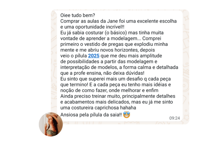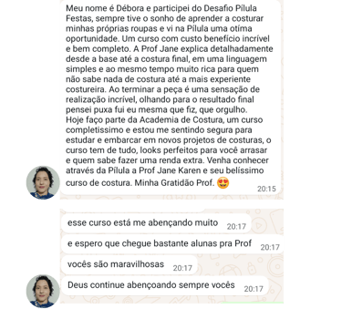 Nesta aula bônus, você vai aprender a Saia com Botões e a Saia EvasÊ usando a mesma modelagem, com detalhes encantadores, ideal para quem quer ampliar seus conhecimentos e criar mais uma peça cheia de estilo. É uma oportunidade de praticar ainda mais, explorar novas técnicas e sair deste curso com duas saias maravilhosas prontas, tudo isso usando apenas a sua máquina doméstica. Um conteúdo bônus pensado com carinho para valorizar ainda mais o seu aprendizado!