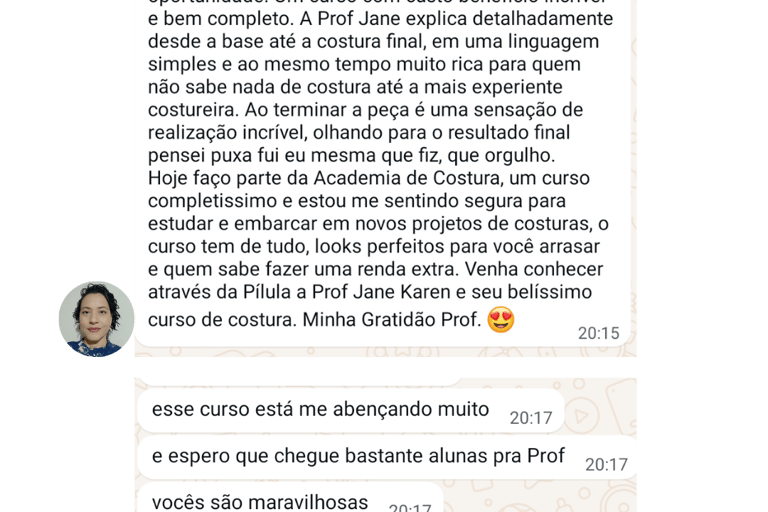 Sou professora de costura e modelagem com mais de 15 anos de experiência, e quero te ensinar tudo que aprendi e venho aprendendo ao longo dos anos.